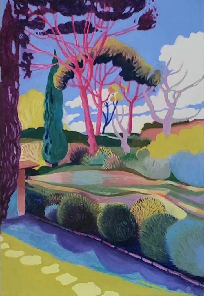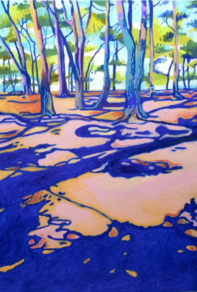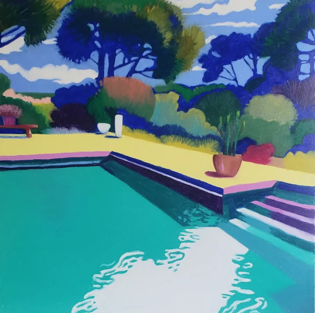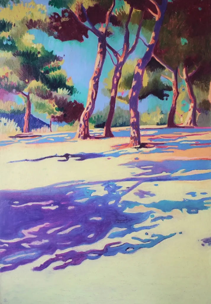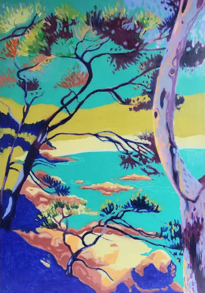 En parallèle, je peins de grandes toiles aux pastels à l’huile, que j’expose et vends dans des salons d’art contemporain. Mes sujets de prédilection sont les paysages, la mer et les pins, où je cherche à capter la lumière, les reflets et les ombres. Dans mes deux univers, je privilégie une palette colorée et lumineuse, reflet de mon goût pour la joie et l’émerveillement.